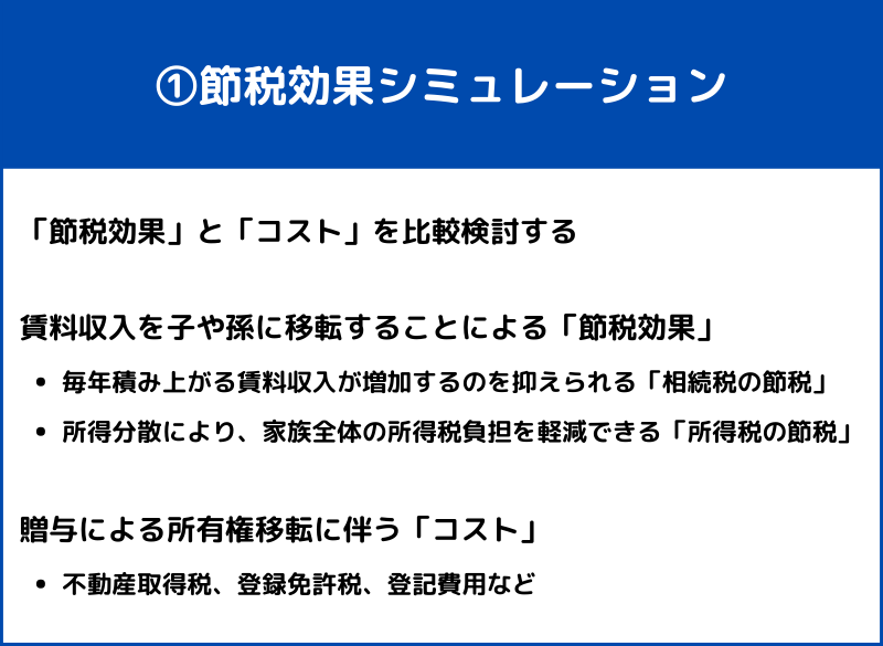 | ①節税効果シミュレーション ②贈与による影響の分析 | 10万円(税込11万円)~ |
